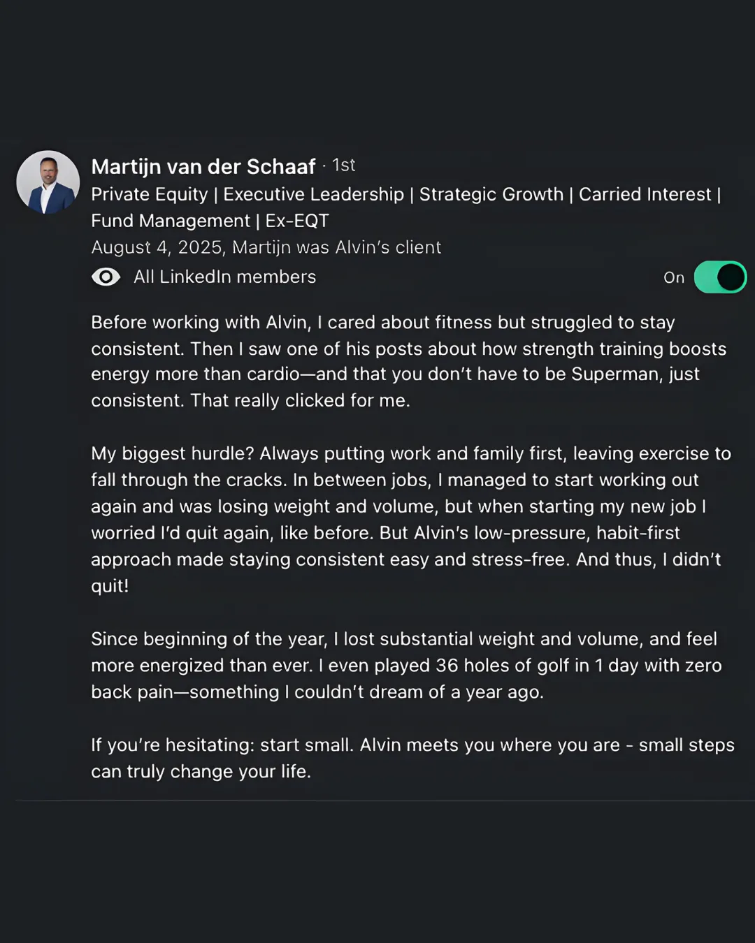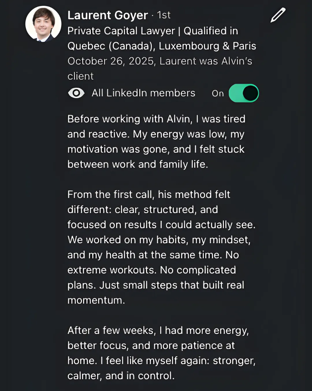 Built for senior financial services professionals in Luxembourg who carry real responsibility and want consistent energy, strength, and clarity, even during high-pressure weeks.